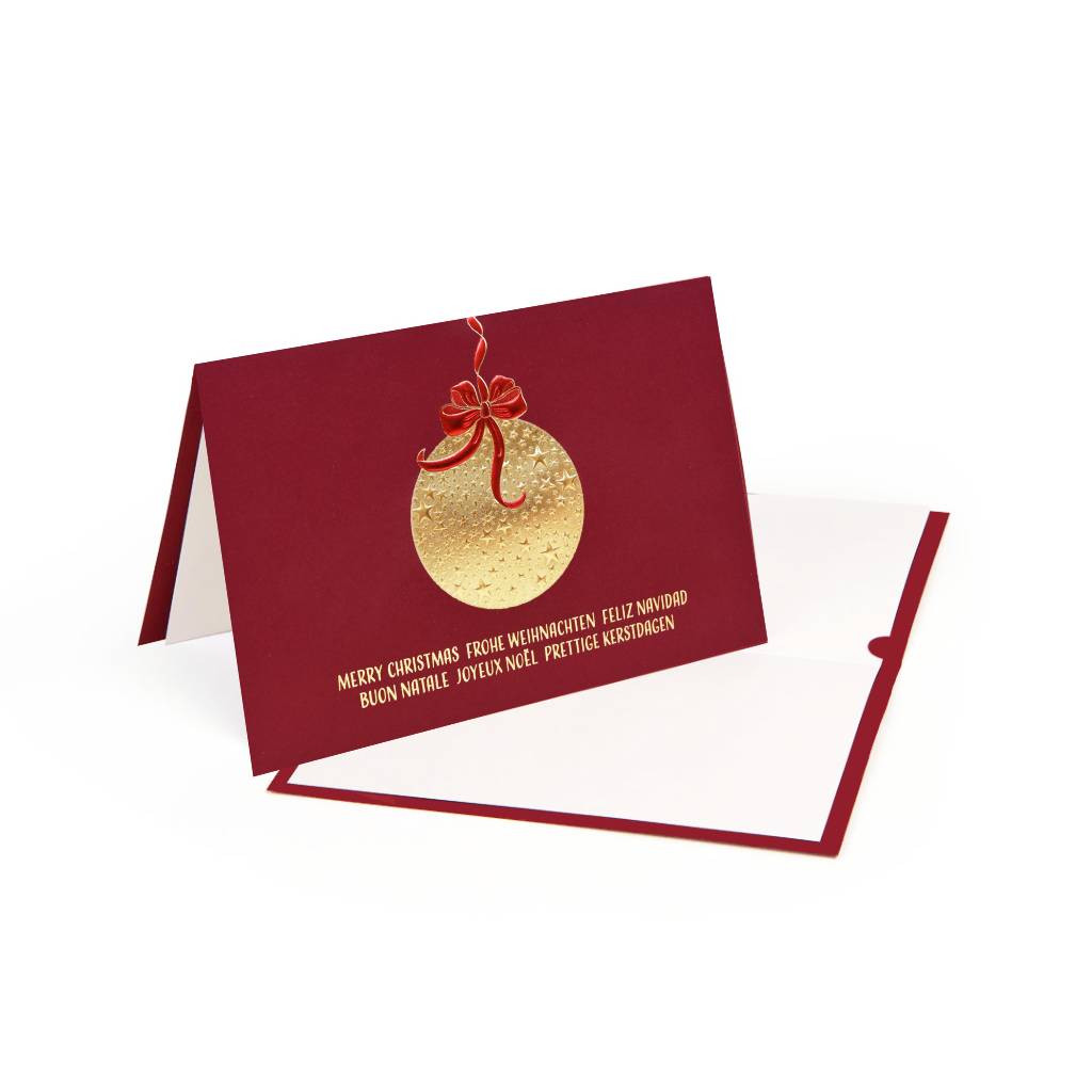 Pregiato cartoncino ad effetto velluto soffice al tatto, con decori in oro e disegno in rilievo e auguri dorati in diverse lingue. All’interno è inserito un cartoncino bianco su cui verrà fatta la personalizzazione. Busta bianca inclusa. Formato: 16,8 x 11,6 cm.