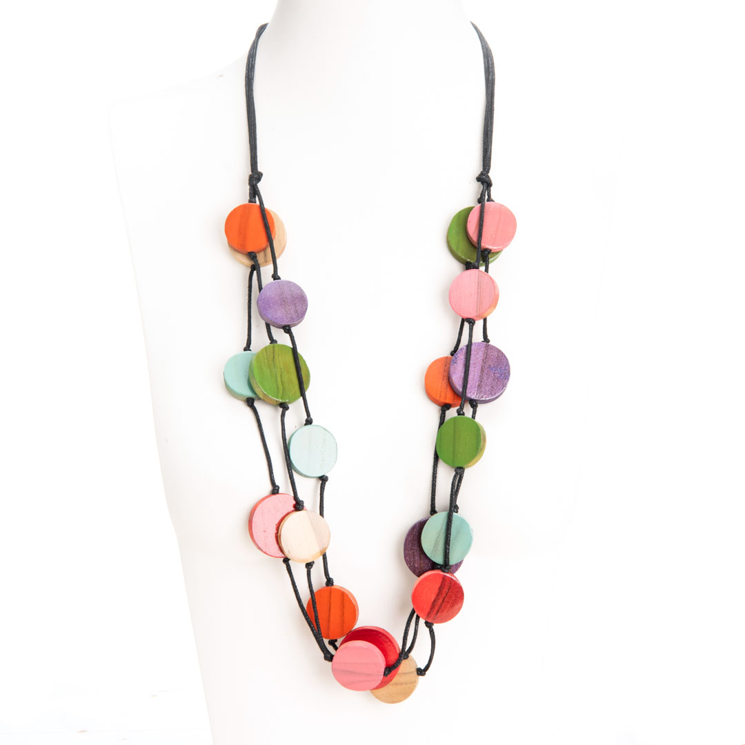 Leggera, naturale e sostenibile: questa collana è realizzata con dischetti di legno di albisia, intagliati e assemblati a mano da artigiani indonesiani. Il legno, proveniente da fonti a ricrescita rapida, dona un tocco caldo e autentico a ogni look. Progetto prefinanziato e a basso impatto ambientale.