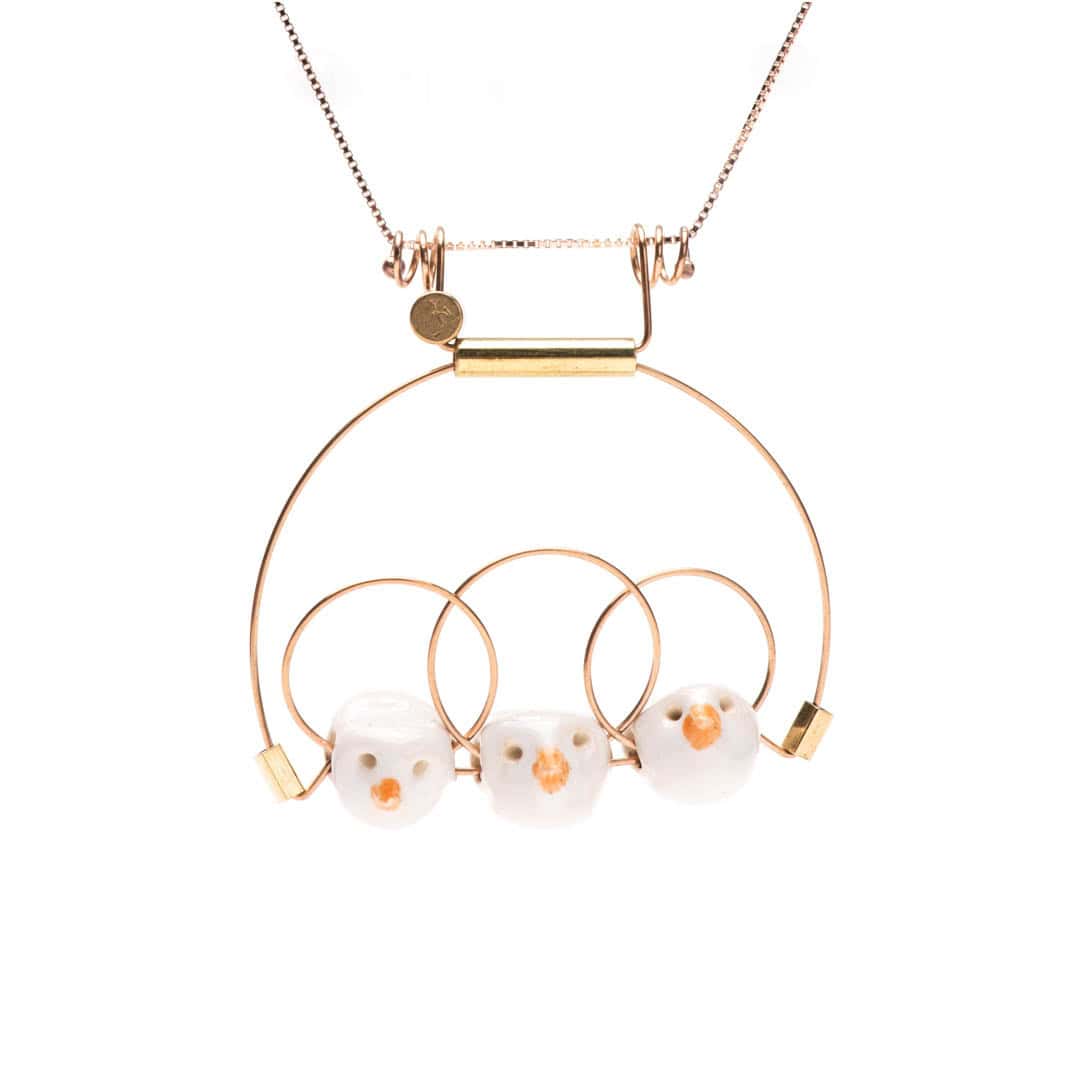 Il tema del monile è la Pace, rappresentata da tre colombe in ceramica smaltata, realizzate a mano in piccole dimensioni e di forma tondeggiante, tali da renderle simili a semi.