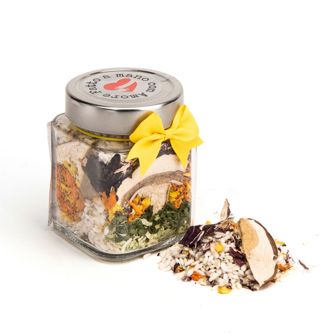 Ingredienti: Riso Carnaroli* 93%, cipolla* 2,5%, funghi porcini e rel. Fam. * 2%, porro* 1%, radicchio* 0,5%, prezzemolo* 0,5%, tagete* 0,5% disidratati.
