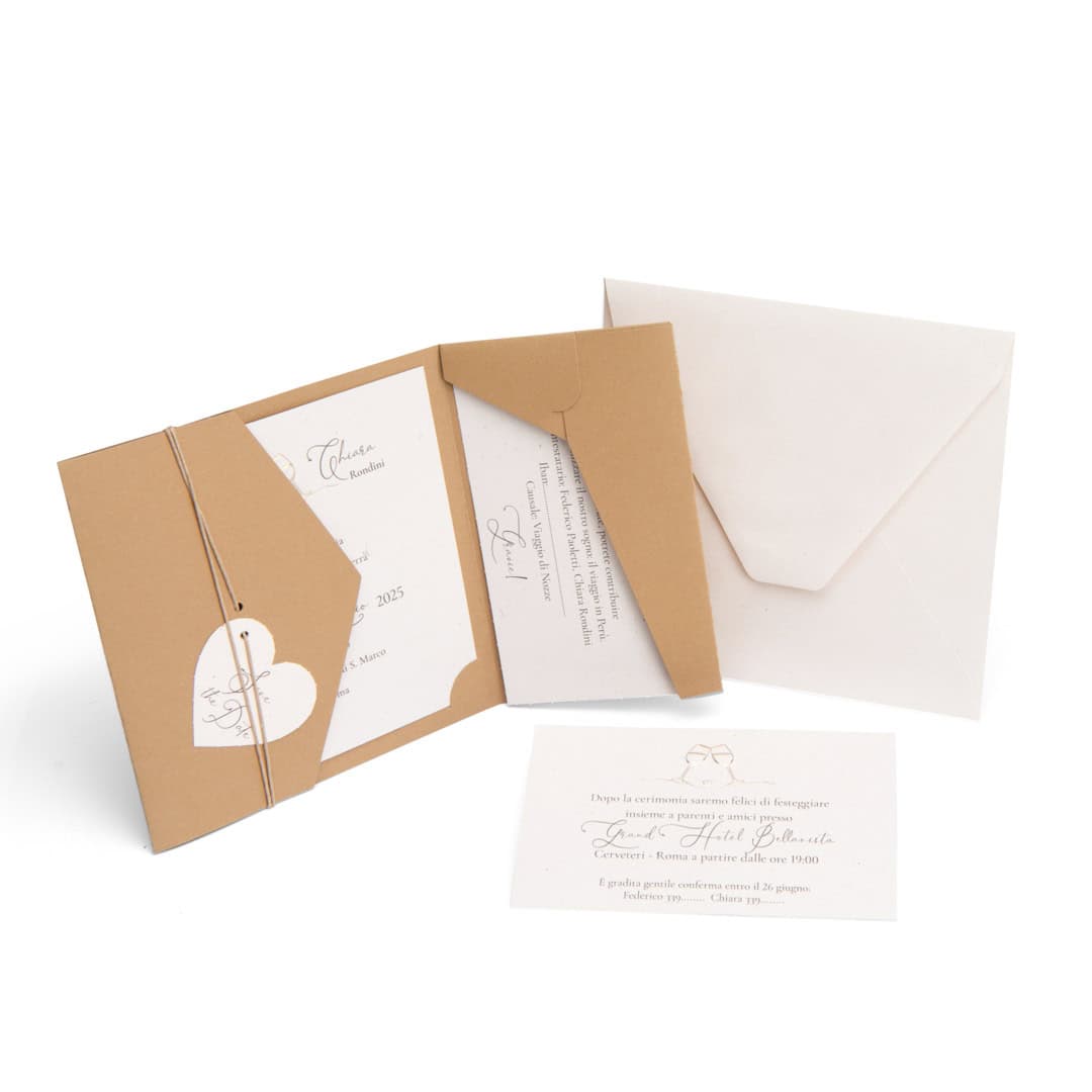 • Partecipazione composta da una cover formato quadrato su carta kraft avorio e in terno su carta avorio betulla con decori in oro a caldo e rilievo. Cordino colore naturale e talloncino a forma di cuore in carta avorio betulla.