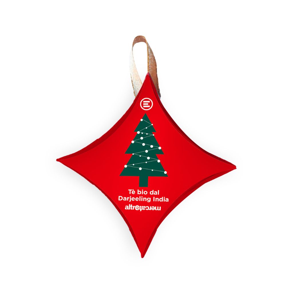 Originali decorazioni, realizzati in collaborazione con Altromercato, con laccetto appendibile per l’albero di Natale contenenti ciascuna 6 filtri di pregiato Te Darjeeling: