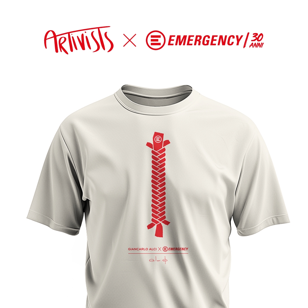 T-Shirt unisex illustrata da Giancarlo Alci, vincitore di “Draw Your Future”, il contest internazionale di EMERGENCY e Desall per immaginare un futuro di pace e celebrare i 30 anni della Ong.
